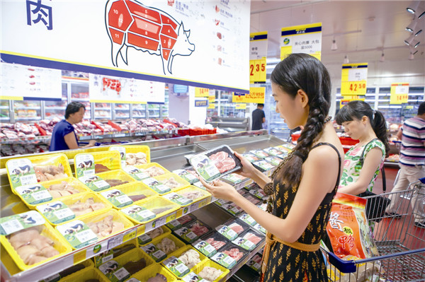 古都西安的麦德龙超市内,顾客正在选购宁乡花猪产品。